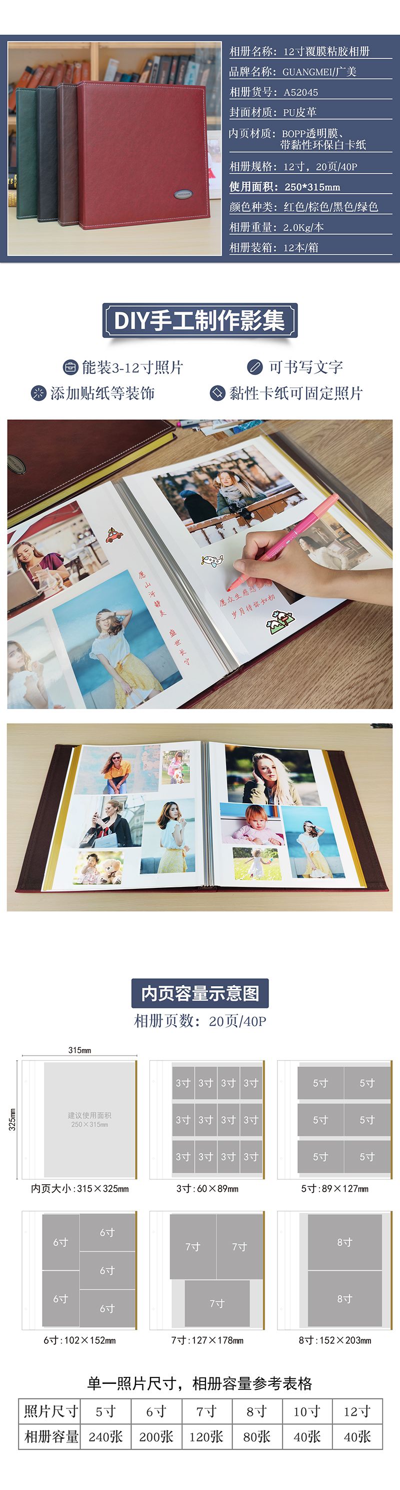 螺丝装PU皮封面12寸覆膜粘胶相册20张(带盒)