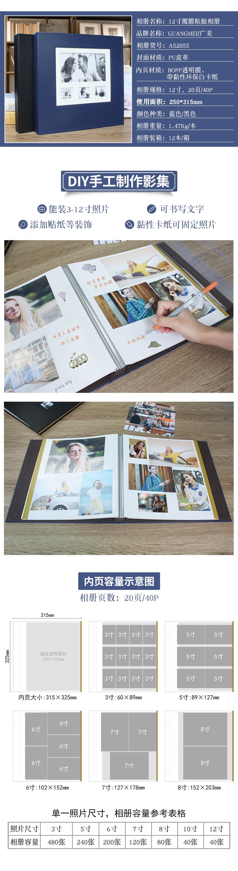 螺丝装PU皮封面开窗12寸覆膜粘胶相册20张(带盒)